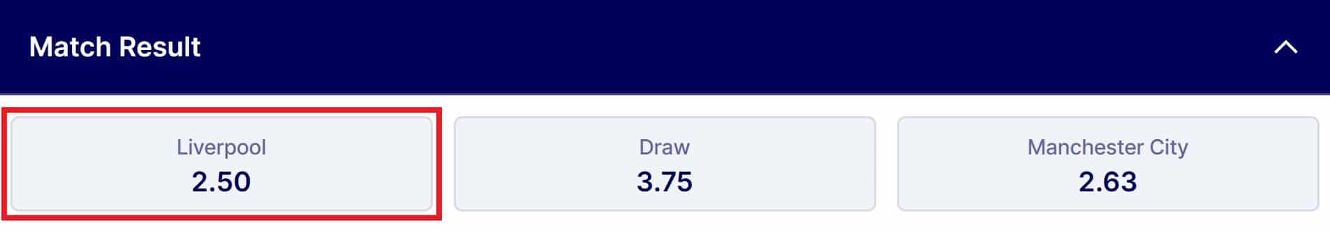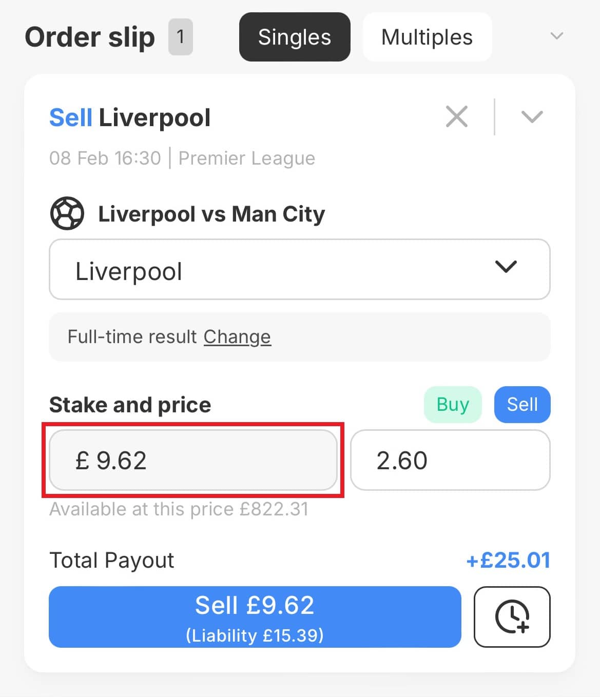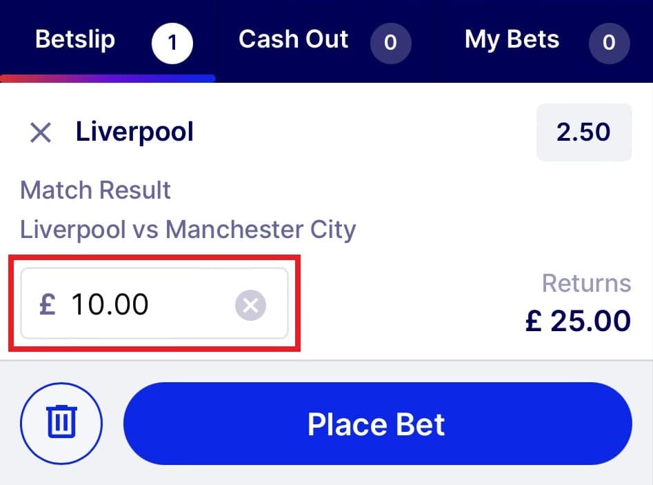 Simply click on the ‘2.50‘ button for ‘Liverpool‘, enter your stake of £10 and click ‘Place Bet‘.