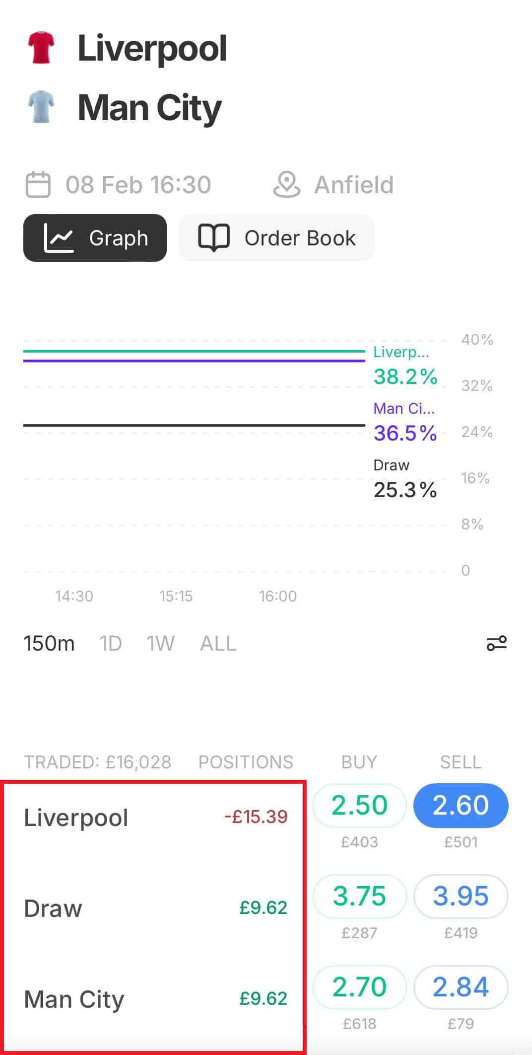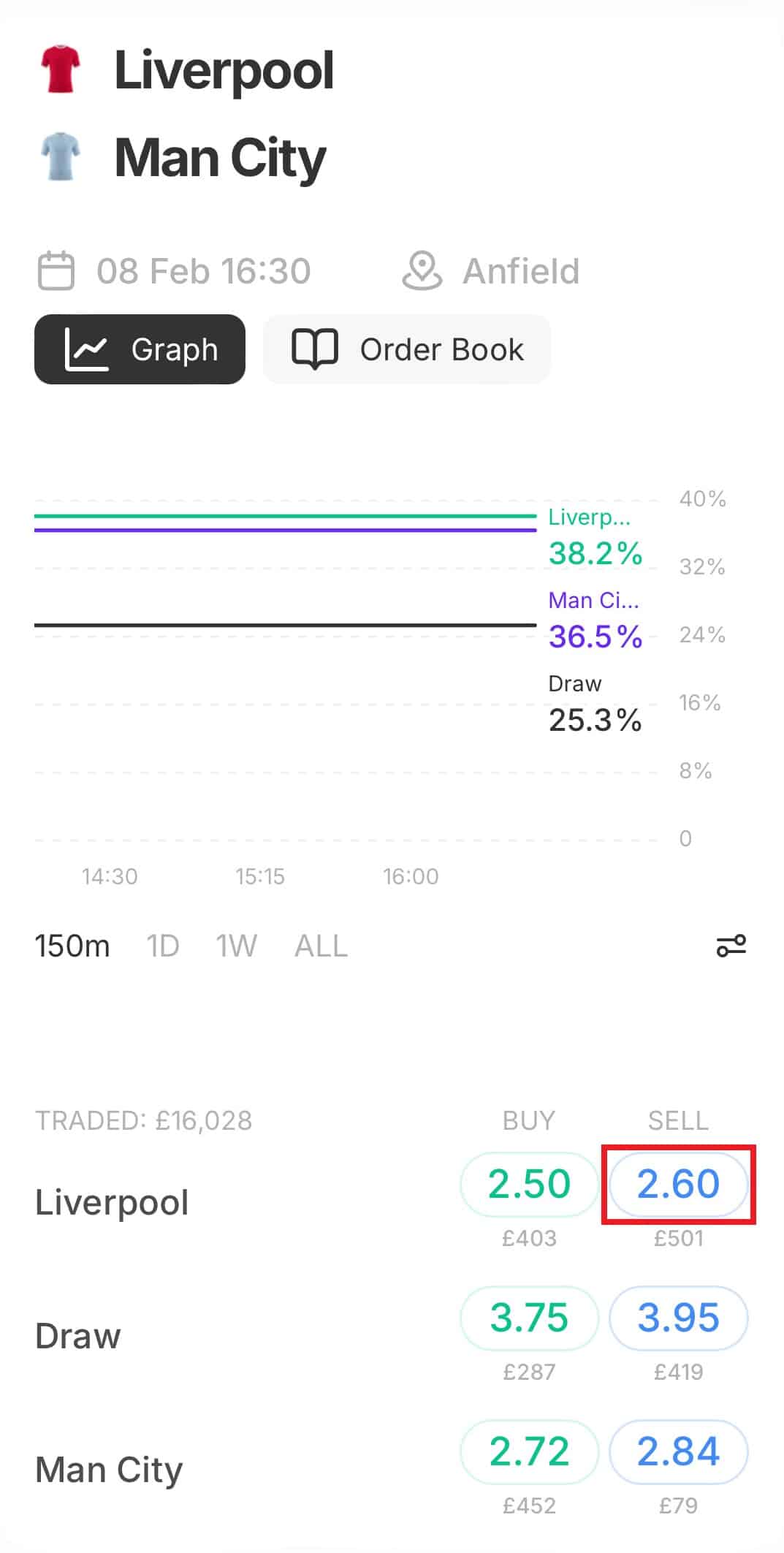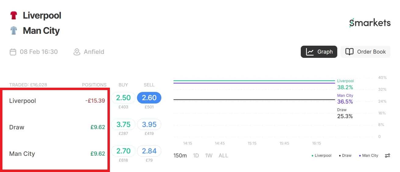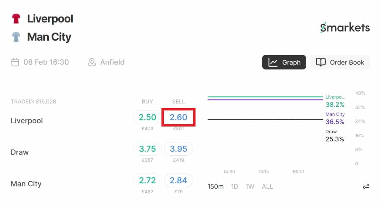 At the time of writing, I’ve found odds of 2.50 for Liverpool to beat Man City (in a Premier League football match) at Betfred, which is your back bet. On Smarkets (your betting exchange), you can lay Liverpool at odds of 2.60. (Remember, laying means you’re taking the role of bookmaker and therefore betting on Liverpool NOT to win).