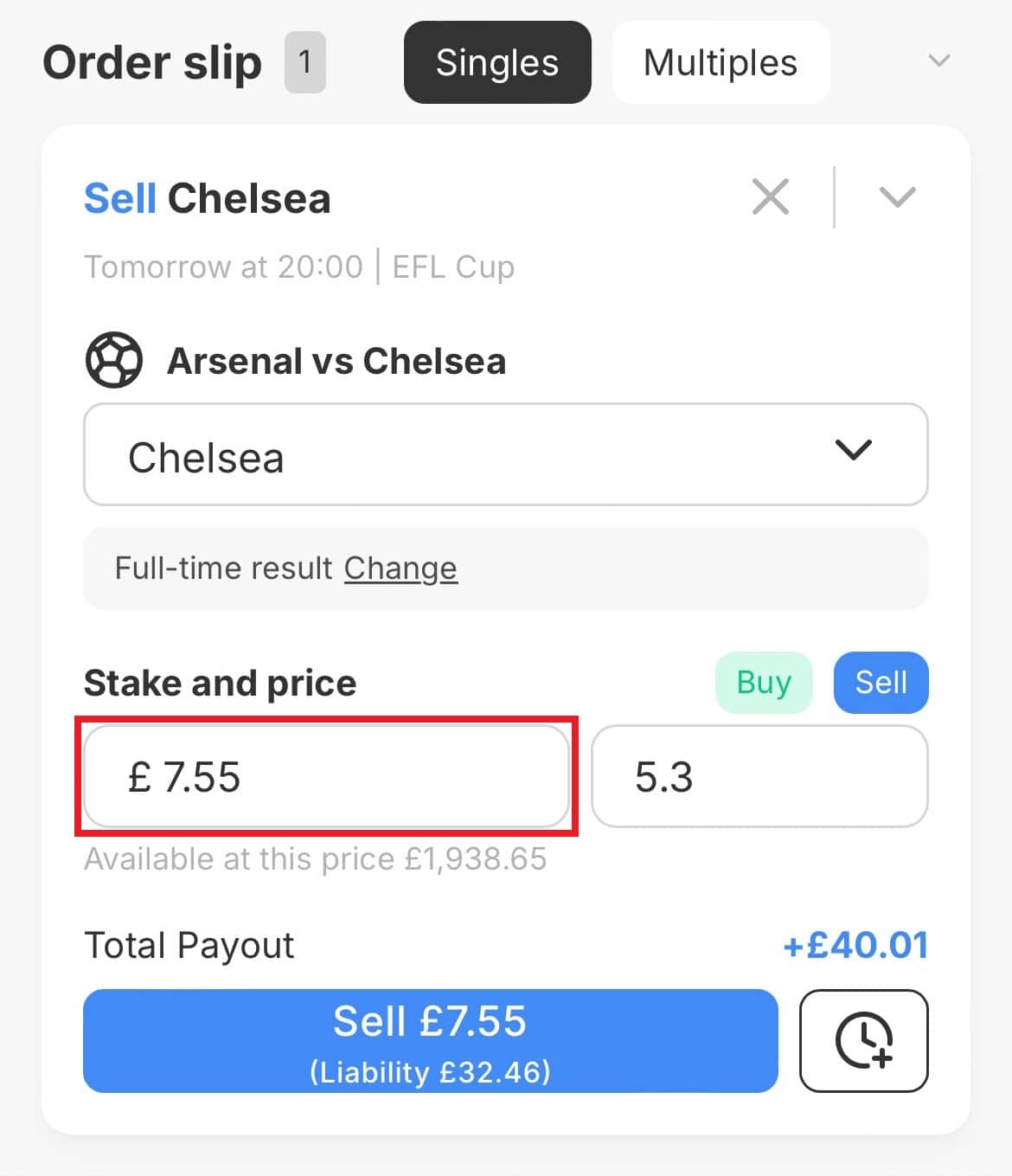As you can see, the calculator tells you that your lay stake should be £7.55. So, just as before, you click on the ‘5.30‘ SELL button at Smarkets and enter your stake of £7.55.